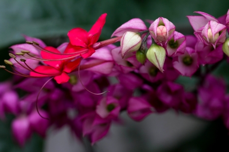 Small red and pink creeper flowers on green background. Bleeding Heart Vine's pink flowers(Clerodendrum thomsoniae 'Delectum')