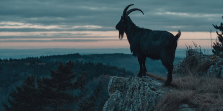 A majestic black goat stands on a rocky precipice overlooking a mountainous landscape at dusk