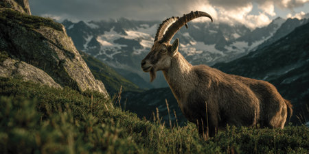 Magnificent mountain goat, with prominent horns, stands on a rocky outcrop against a backdrop of snowy, high mountains. The image captures the animal's presence in its natural habitat, showcasing the beauty of alpine scenery.
