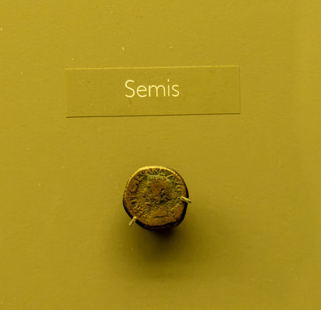 Close-up view of an ancient Roman semis coin in a museum exhibit. Highlights the craftsmanship and historical value of Roman currency.