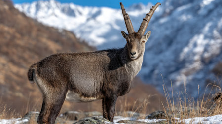 An ibex stands proudly on a mountainside, looking towards snow-capped peaks