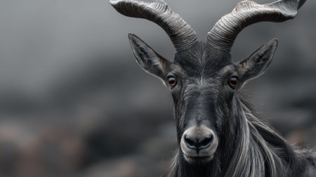 A striking portrait of a black goat displaying its prominent curved horns, set against a softly blurred rocky backdrop in the wild.