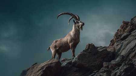 A majestic mountain goat stands confidently on a rocky peak, surrounded by a dramatic sky, embodying strength and freedom in nature's wilderness.