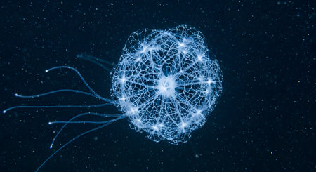 A creature resembling a jellyfish, composed of an intricate, glowing blue network of light, floats in a dark environment speckled with particles like stars or plankton. This abstract image combines biology with technology, suggesting concepts like neural networks, deep sea life, or alien organisms.