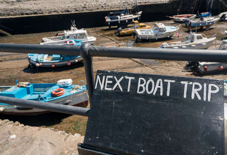 Boats beached in the mud in harbor as a sign announces next boat trip