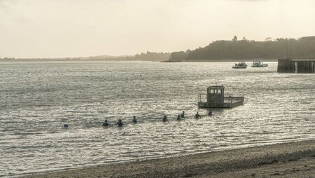 athletes on the beach doing leg work in the water for blood circulation and muscle strengthening
