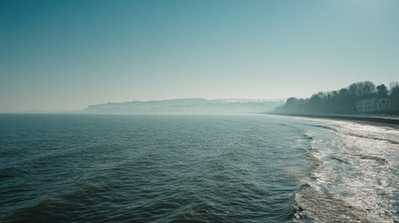 A peaceful coastal scene featuring gentle waves lapping at the shoreline under a clear blue sky, evoking a sense of tranquility and connection with nature.