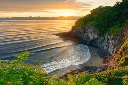 A Stunning sunset over serene coastal landscape with waves Generative Ai