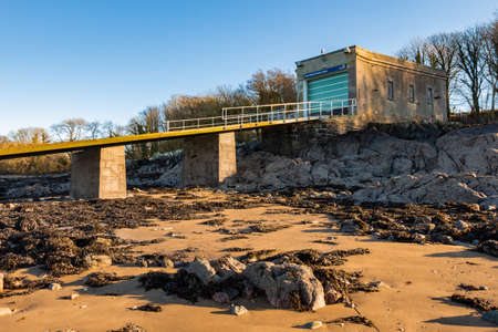 Kirkcudbright, Scotland - January 8th 2021: Kirkcudbright Lifeboat Station boat house, launch slipway ramp and beach on a sunny winters day