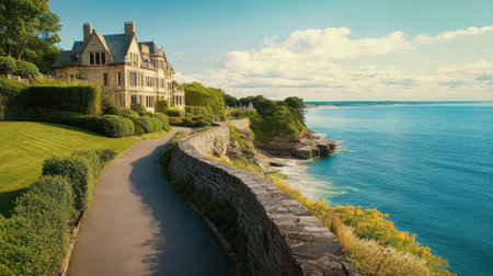 Visitors stroll along the picturesque path of Cliff Walk, surrounded by lush greenery and breathtaking ocean views under a clear blue sky.