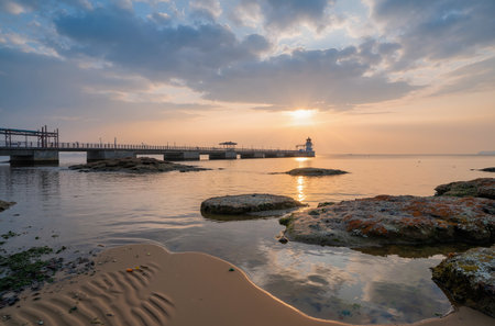 Wooden bridge leading to the sea at sunset. Beautiful seascape.