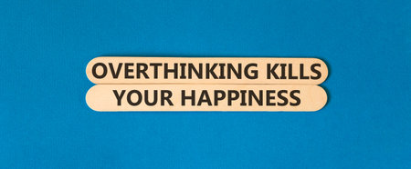 Overthinking kills your happiness symbol. Concept words Overthinking kills your happiness on wooden sticks. Beautiful blue background. Business overthinking kills happiness concept. Copy space.