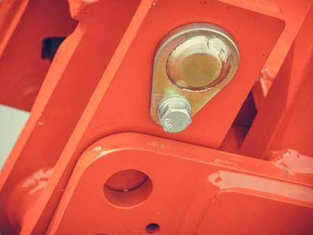 Agriculture equipment concept. Abstract detailed close up of red machinery.