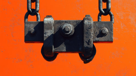 This image features a close-up view of a heavy metal coupling secured by chains, set against a striking orange background, highlighting industrial strength and design.
