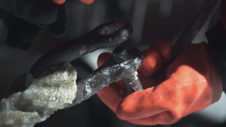 Hands close-up tighten the screw. CLIP. Men's hands in orange gloves on board the ship tighten the screw from the ship's anchorage at night.
