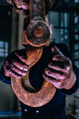 Workers hand with big industrial pulley hook