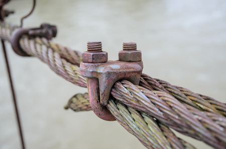 Closeup of metal fasteners and steel wire rope, metal clamp