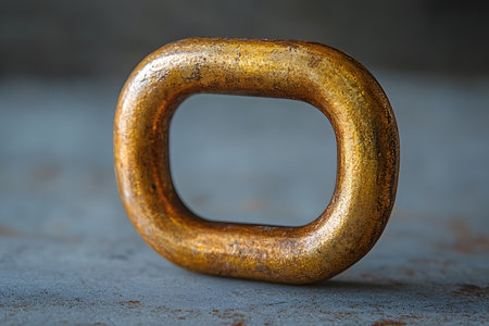 Rusted metal ring with a textured surface placed on a rough gray background. the warm copper tones contrast with the cool, muted backdrop, making it ideal for artistic or industrial-themed designs and projects. Generative AI