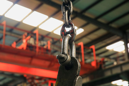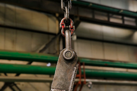 Industrial crane hook and chain hanging from an overhead system, ready for heavy lifting in a manufacturing or storage facility
