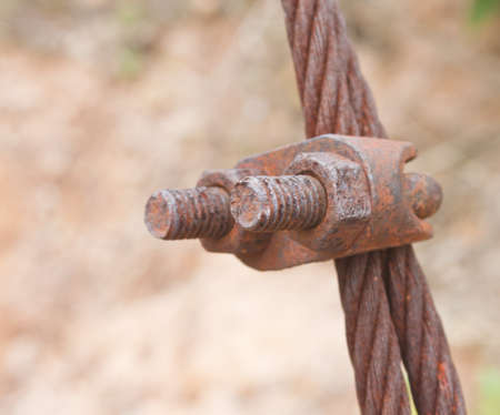 Close up old and weathered wire rope clip or clamp and turnbuckle