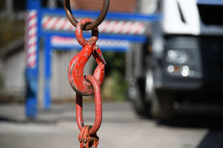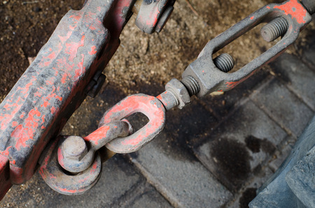 Old rusty hook and chain on the car. Close-up.