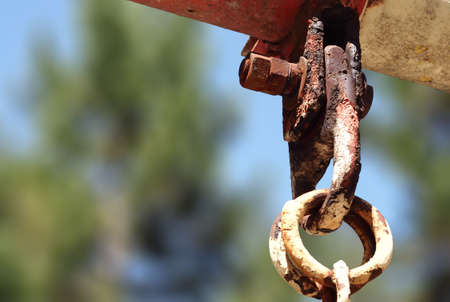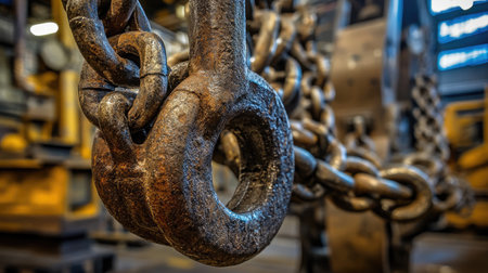 Rusty chain and hooks detail in construction setting, symbol of strength, durability and transport work