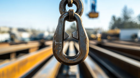 A powerful image showcasing a heavy chain and hook suspended in an industrial setting, emphasizing the critical role of machinery and construction in urban development.