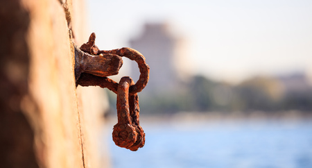 Old rusty bollard waits at quay for boat to be tied. Blurred backdrop, close up, details, banner