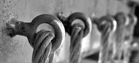 This image showcases a close-up view of twisted steel cables with metal hooks, illuminated by soft light, capturing the texture and industrial strength in detail.
