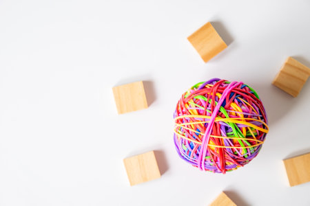 Vibrant multicolored rubber band ball centered among six wooden cubes on white background, representing creativity, uniqueness, and standing out from the ordinary concept.