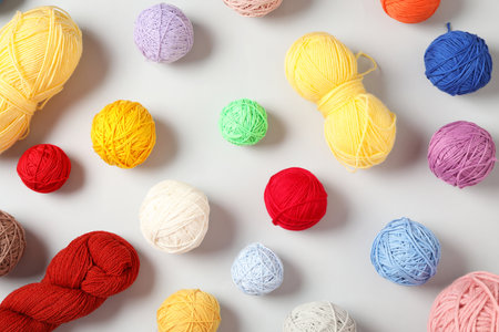 Soft colorful woolen yarns on white background, flat lay