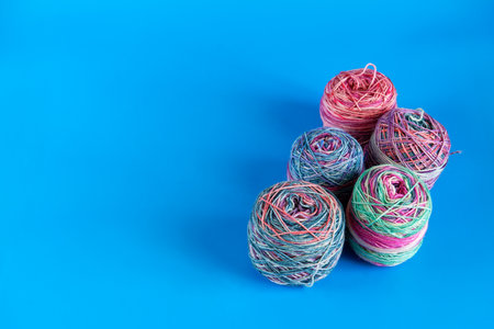 Various colored balls of yarn on a blue background. Space for text