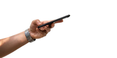 hand holding smart phone isolated on white background.
