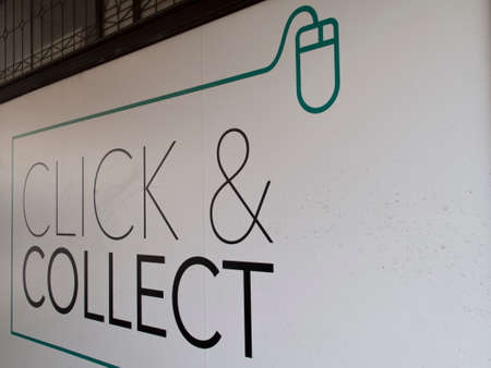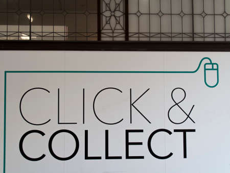 Debenhams Department Store click and collect sign on side wall of premises, company formed in 1778 by William Clark