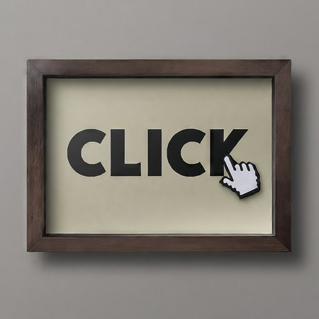 3D representation of click with icon on the wall and text arranged by metallic cubic letters on a mirror floor for concept meaning and slideshow presentation. illustration and button
