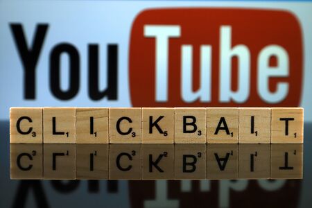 WROCLAW, POLAND - FEBRUARY 12, 2020: Word CLICKBAIT made of small wooden letters, and YOUTUBE logo in the background. Studio shot.