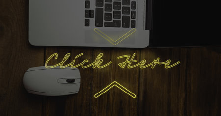Image of click here text over laptop. Global business and digital interface concept digitally generated image.