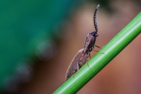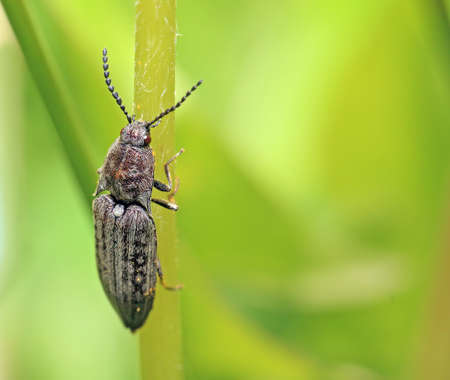 Beetle crawling on a stalk of grass .Insects are very active during the day.The Latin name for the beetle is Ctenicera pectinicornis.