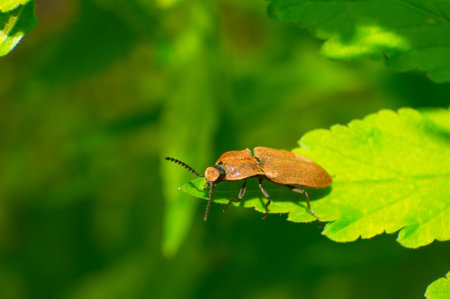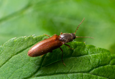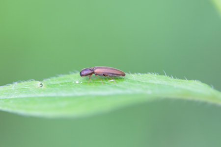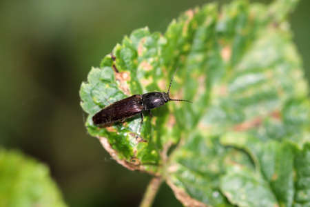 Closeup on a brown hairy clicking beetle, Atthous haemorrhoidalis, sitting on a green leaf in the forrest.