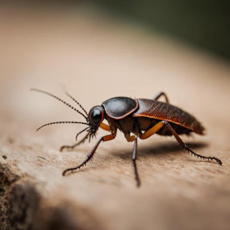 This striking close-up captures a red and black beetle crawling on a textured surface, showcasing its intricate details. The vivid colors and sharp features of the beetle create a captivating image that highlights the beauty of natures small wonders.