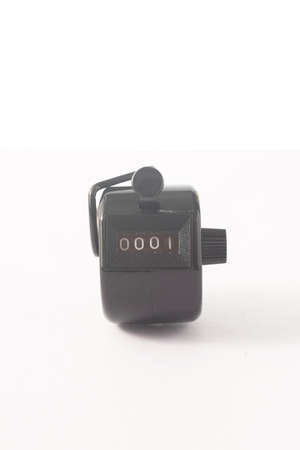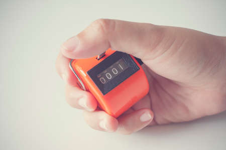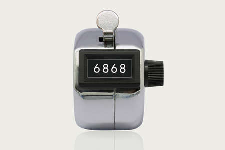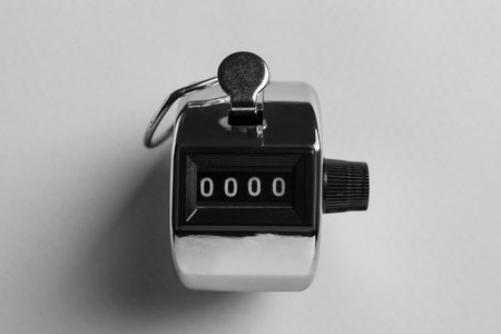 Tally counter or counting machine with 0000 number on white wooden table, business and finance concept idea.