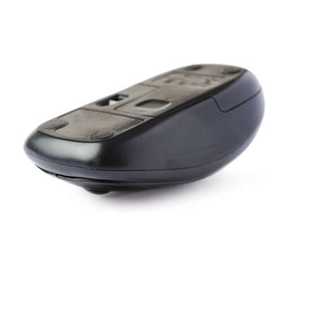 black computer mouse at caucasian person hand. isolated on a white background. hardware and web surfing concept