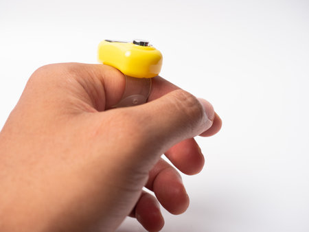 The image features a hand holding a small, rectangular object with black and yellow colors. The object appears to be a gadget or device. The image is set against a white background, making the object stand out clearly. This image is ideal for product showcases or tech-related content.