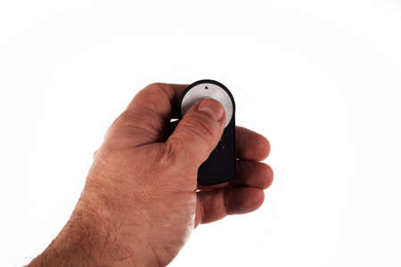 Asian male dark skinned single hand fist finger on black background holding remote control pressing on the button