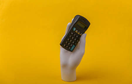Asset account. Financial crisis 2021. Statement analysis. Business profit. Woman hand holding calculator displaying digital number isolated on black empty space background.