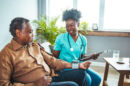 African american male doctor examining blood pressure of caucasian senior woman with gauge at home. Sickness, armchair, unaltered, hypertensive, healthcare, patient, retirement and recovery concept.