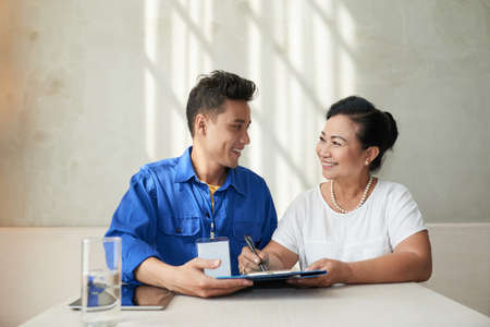 Smiling elderly woman signing contract with handyman or cleaning service manager