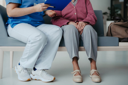 Close up of nurse and senior patient legs, sitting in hospital corridor and talking. Emotional support for elderly woman.