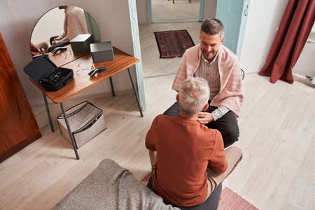 Adult man with towel at his shoulders sitting at the chair in front of his senior father