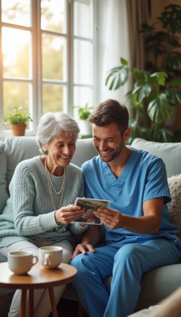 A warm scene captures a caregiver in scrubs sharing a heartfelt moment with an elderly woman, both smiling as they look at a graph. The cozy atmosphere, filled with natural light and greenery, highlights the bond of care and companionship in this touching interaction.